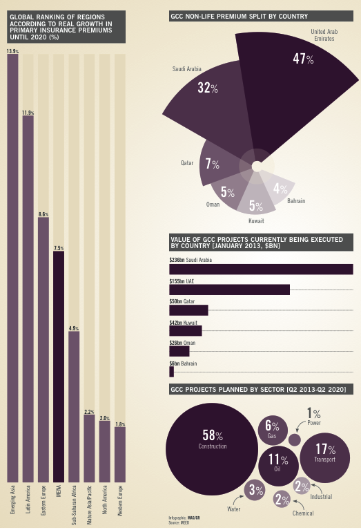 In stark contrast to the stagnant US and Europe, the Middle East market is projected to grow at a compound annual rate of 4.7% between 2013 and 2020 (see graph), owing to low insurance penetration, rising awareness and introduction of compulsory covers, among other factors. Nevertheless, the MENA continues to represent only a low proportion of global premium income (about 2.5%).